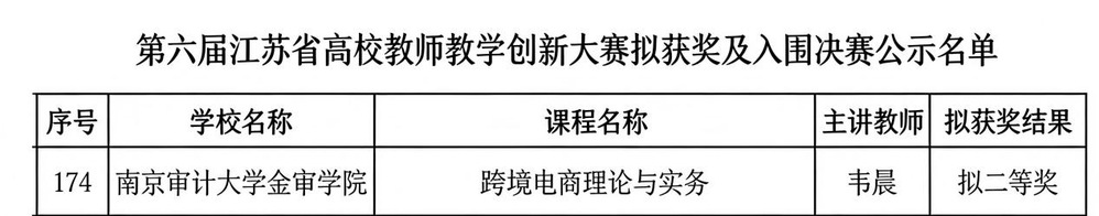 近日,第六届江苏省高校教师教学创新大赛评审结果正式公布,我校金融与经济学院韦晨老师主讲的《跨境电商理论与实务》课程荣获省二等奖(参赛组别:新文科赛道中级及以下职称组)。作为省内为数不多获奖的民办高校之一,这是我校在本项赛事中持续发力的又一重要成果,充分体现了深耕教学创新、精进内涵建设的显著成效。